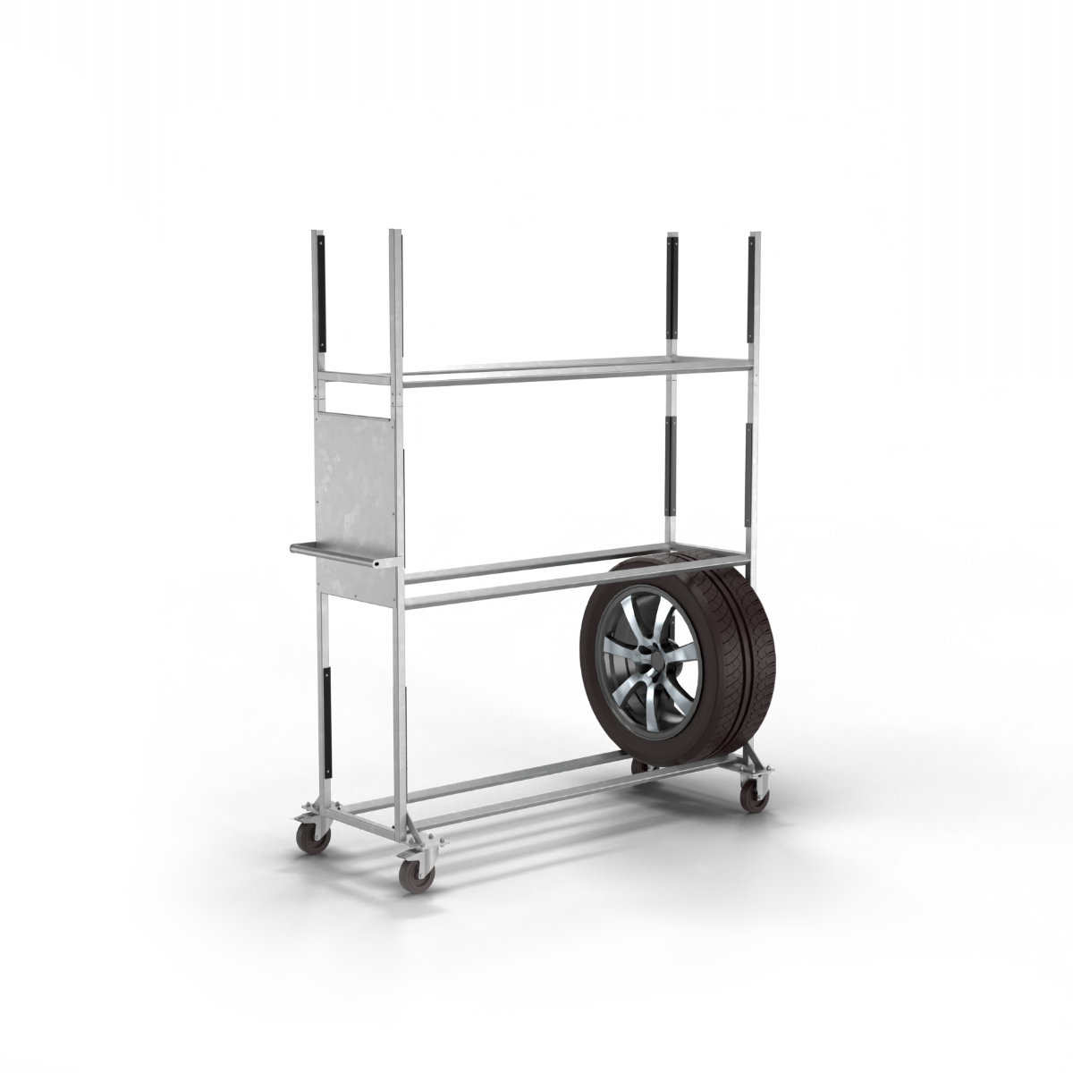 Ein robuster und funktionaler Stahlwagen mit einer Tragfähigkeit von 600 kg, ideal für die Lagerung und den Transport von Rädern und Reifen. Besonders nützlich in Werkstätten und Servicezentren während des saisonalen Reifenwechsels.